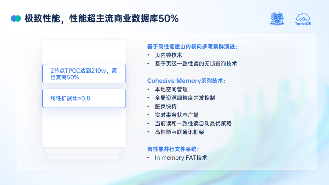 据孟凡彬介绍,在早期进行内核设计时,YashanDB 充分考虑了向共享集群形态的演进,事务管理、MVCC 机制等内核技术天然适合共享集群,为后续的扩展打下坚实基础。此外,崖山共享集群的极致性能表现还离不开其背后的两项关键技术——Cohesive Memory 和 In memory FAT 技术。