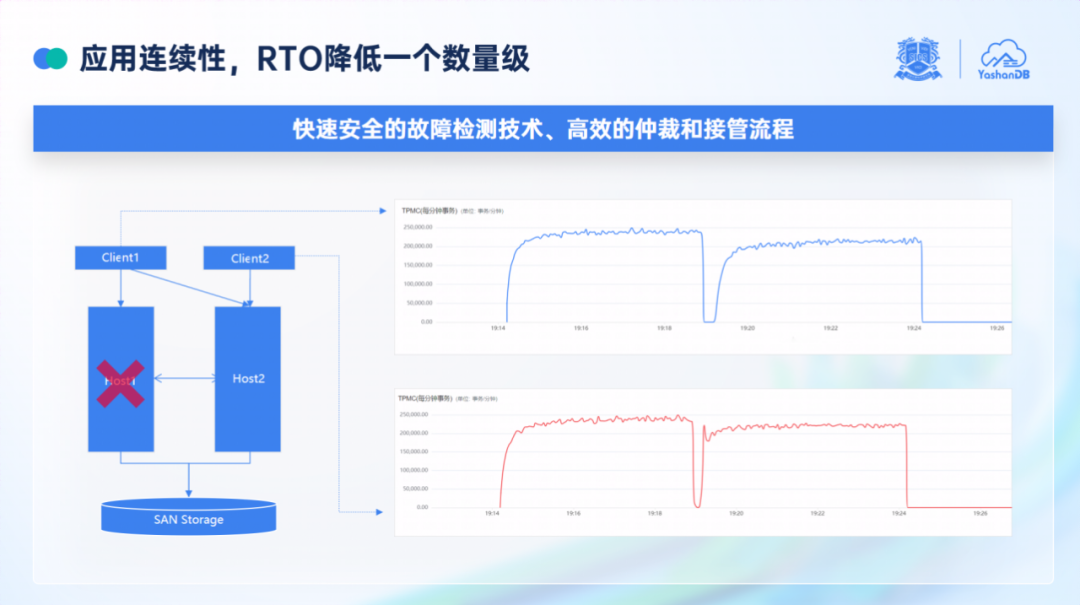 值得一提的是,在发布会现场进行了“拔网线、掐电源”极端情况下的故障模拟,崖山共享集群的 RPO(数据丢失量)为 0,能够确保故障切换不丢数据,故障恢复时间 RTO 小于 20 秒。针对高可用性,孟凡彬在发布会上表示:“YashanDB 的共享集群全面考虑了各种故障模式,包括网络故障、进程挂起、磁盘 IO 超时等,对所有业务流程进行了故障容错的设计,最终实现了端到端完备的应用连续性。”