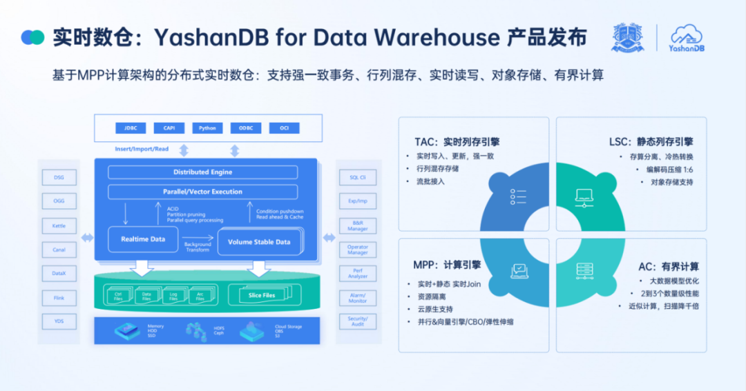 由此,一个具备大容量、高压缩、强一致、高性能入库、强分析查询能力的实时数仓产品 YashanDB for Data Warehouse 正式诞生。