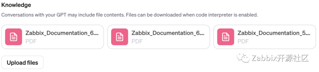 我们点击Knowledge下的Upload files,上传提前准备好的Zabbix API文档(这里上传的是由Zabbix官网下载的Zabbix 5.0、6.0和6.4三个主流版本的PDF文档)。