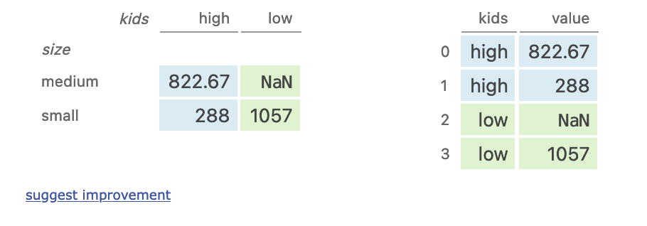 dogs.pivot_table(index='size', columns='kids', values='price')
