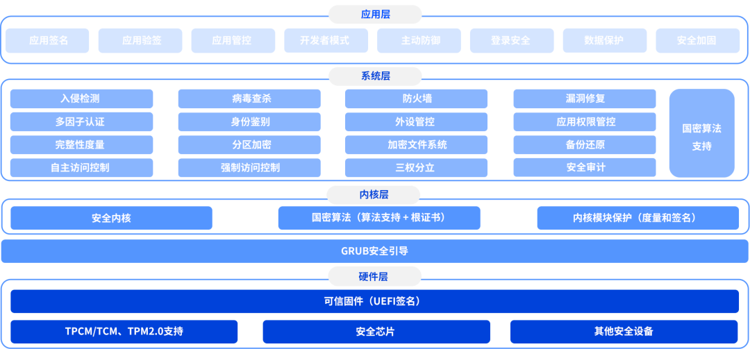 产业飞速发展,规模持续扩大,产业安全需要更高指引,更强架构与更开放的体系与生态支持。统信UOS具备高标准指导和全架构引领,基于分层分类理论,从自身安全、生态安全和供应链安全多维度打造和提升全栈安全能力。
