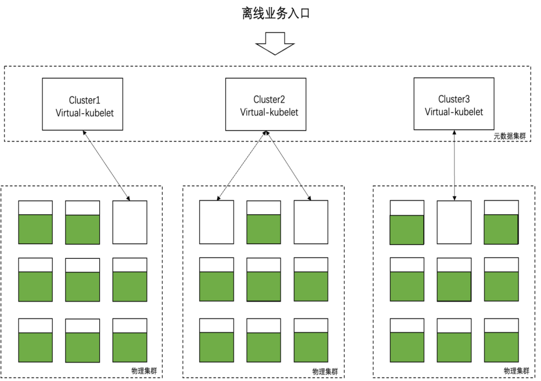 我们通过 virtual-kubelet 打通元数据集群与物理集群,将闲置资源汇聚起来,在元数据集群分配给转码类场景近线/离线计算服务。策略方面,二次调度器负责巡检集群所有节点,识别为低效节点后标记出来,virtual-kubelet 获取物理集群中的低效节点可用资源作为集群闲置资源二次分配给离线转码,同时二次调度器需要保证一旦在线服务有资源需求,将会立刻驱逐离线 pod 并归还资源。