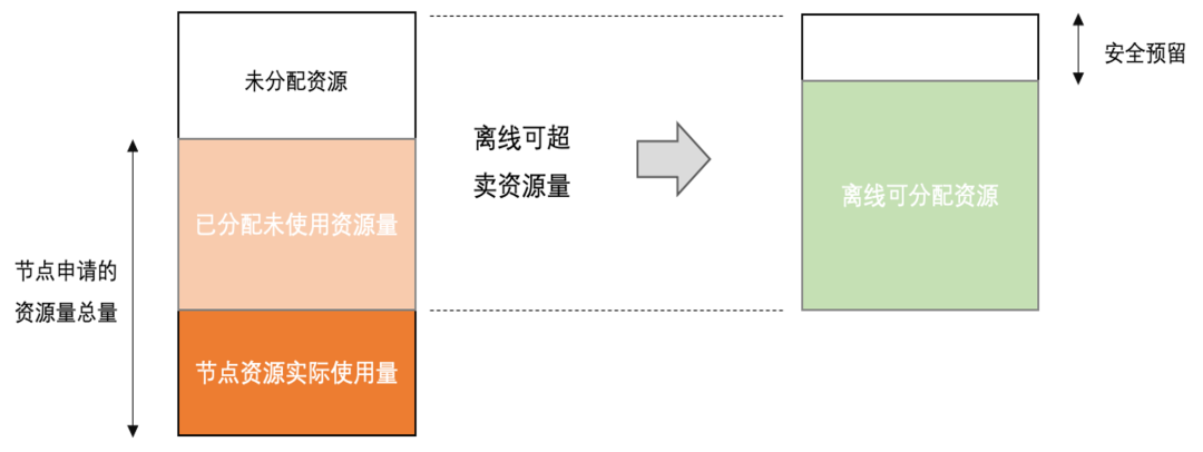 离线服务资源调度的基本原理是基于在线服务负载感知能力的动态超卖,具体实现是将节点空闲资源二次分配给离线业务: