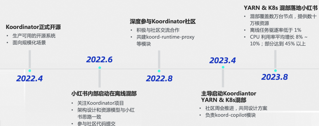 小红书是早期参与 Koordinator 社区的公司之一,2022 年 4 月,Koordinator 正式开源,同年 6 月,小红书内部启动了在离线混部项目,开始参与 Koordinator 方案设计与代码提交。2022 年 8 月,小红书与社区共建了 runtime-proxy 组件,并在内部场景落地。2023 年 4 月,小红书在社区主导启动了 YARN 与 K8s 混部项目,2023 年 8 月,该方案在小红书内规模化落地。