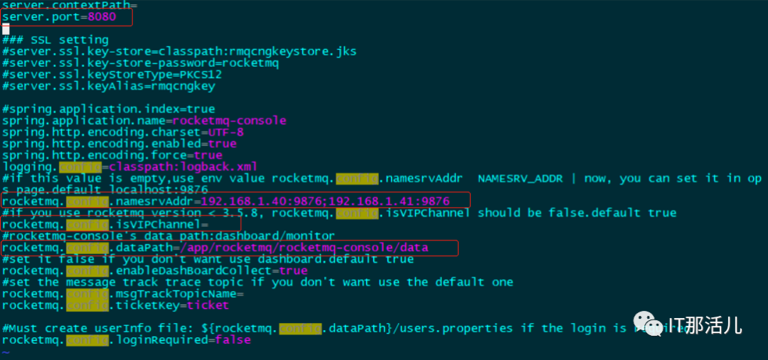 server.port #是管理界面端口设置,默认为8080; rocketmq.config.namesrvAddr #如果nameserver有多个,则后面就配置多个ip+port,用分号 分割; rocketmq.config.isVIPChannel #注意这个参数,默认为true,如果rocketmq版本号 < 3.5.8 则设置为false; rocketmq.config.dataPath #