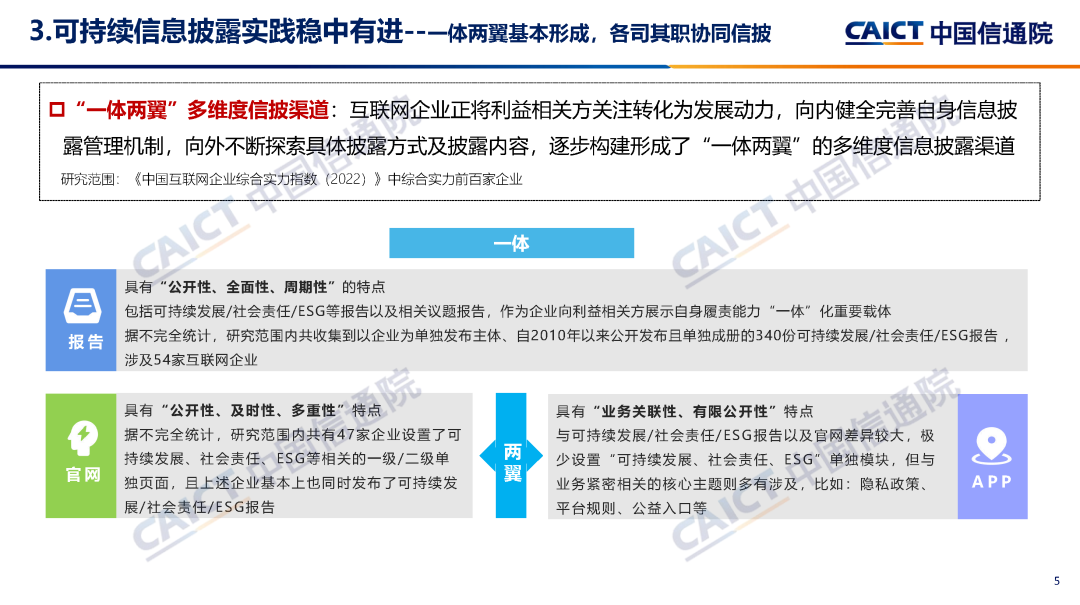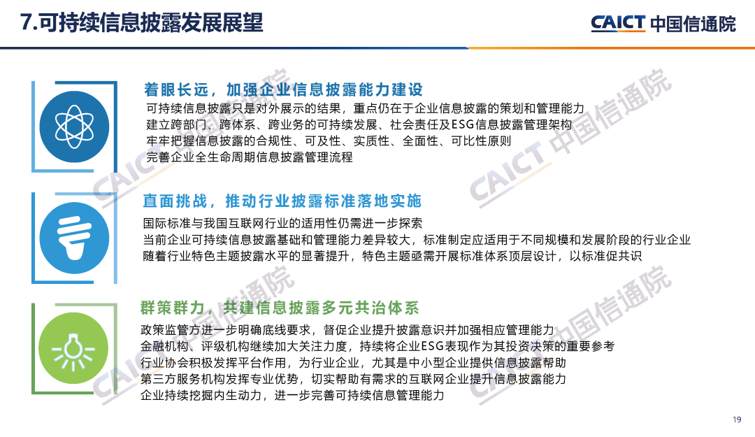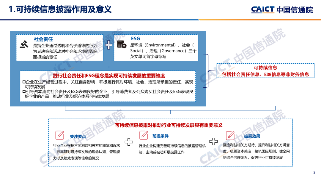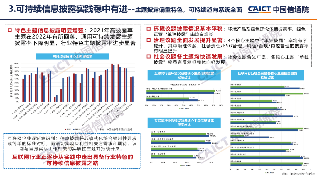 当前,我国互联网行业蓬勃发展,正在更广范围、更深程度地影响着国家社会发展和人民群众生产生活的方方面面。互联网行业深入践行可持续发展理念,加强社会责任及ESG管理,推动可持续信息披露,不仅是健全网络综合治理体系、推动形成良好网络生态的有效途径,也是接轨国际规则、提升国际化竞争力的实际需要,更是贯彻落实党的二十大精神、实现高质量发展的必然要求。