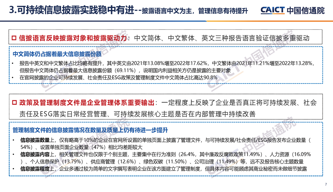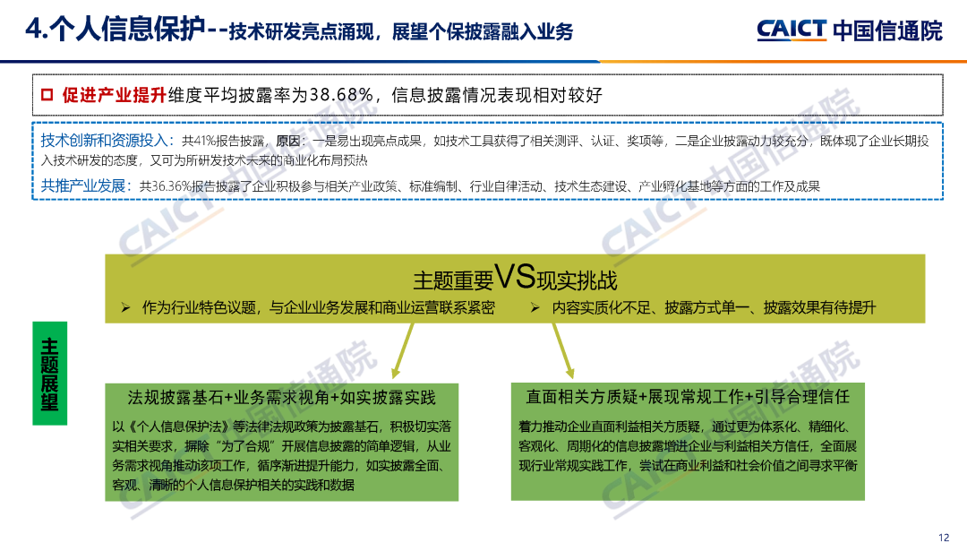 这是中国信通院第二年发布相关领域研究成果,在国内外信息披露要求逐步明确、关注重点进一步聚焦、行业特性渐进发展的背景下,报告进一步系统研究了互联网行业可持续信息披露的整体实践情况,首次分析了官方网站及移动互联网应用程序等行业特色信息披露渠道,重点关注了个人信息及用户隐私保护、透明规则和碳信息三个核心主题的信息披露实践发展,期望能为社会各界了解互联网行业及其特色主题的可持续信息披露发展提供有价值的参考。