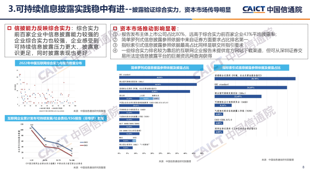 1. 互联网行业可持续信息披露整体实践稳中有进。一是互联网行业逐步构建形成了以可持续发展报告为“主体”,以官方网站和移动互联网应用程序为“两翼”的多维度信息披露渠道。二是报告数量逐年提升,报告质量基于定量化数据、第三方机构验证、利益相关方沟通和实质性议题分析共四个维度的信息披露情况分析,基本平稳发展。三是ESG报告数量大幅增长,占比已接近半数,资本市场对行业推动影响越发显著,简单罗列式和指标索引式信息披露参照依据中,来自证券方面要求占比均排名第一。四是企业可持续发展、社会责任、ESG相关的政策及管理制度文件在信披数量、信披质量、信披程度均仍有较大提升空间。五是行业特色主题信息披露进步显著,通用可持续发展主题披露率下降明显,环境、社会、治理各主题“单独披露”率虽有反复但整体披露情况向好发展。互联网行业正逐步从实践中走出具备行业特色的可持续信息披露之路。