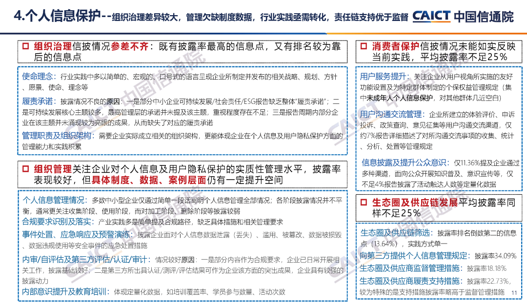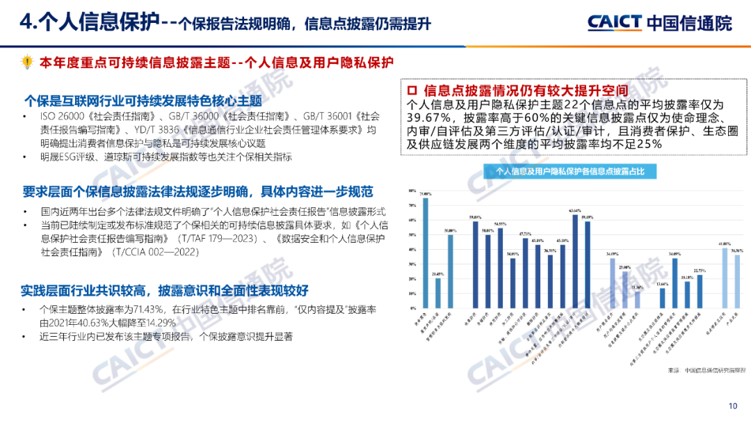 2. 互联网行业个人信息保护信息披露逐步发展。《个人信息保护法》明确提出“定期发布个人信息保护社会责任报告”,当前个人信息和用户隐私保护主题整体披露率为71.43%,但22个关键信息披露点的平均披露率为39.67%,仅有使命理念、内审/自评估及第三方评估/认证/审计披露率高于60%,披露内容实质性和信息全面性提升空间较大。互联网企业应进一步以业务需求视角推动信息披露,通过更体系化、精细化、客观化、周期化的信息披露增进利益相关方信任,全面展现行业实践工作。