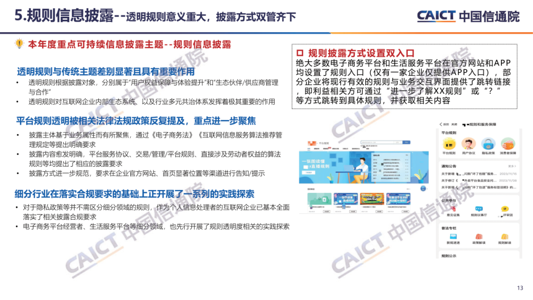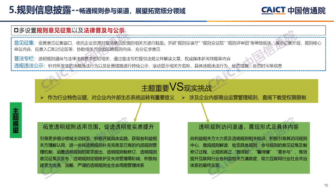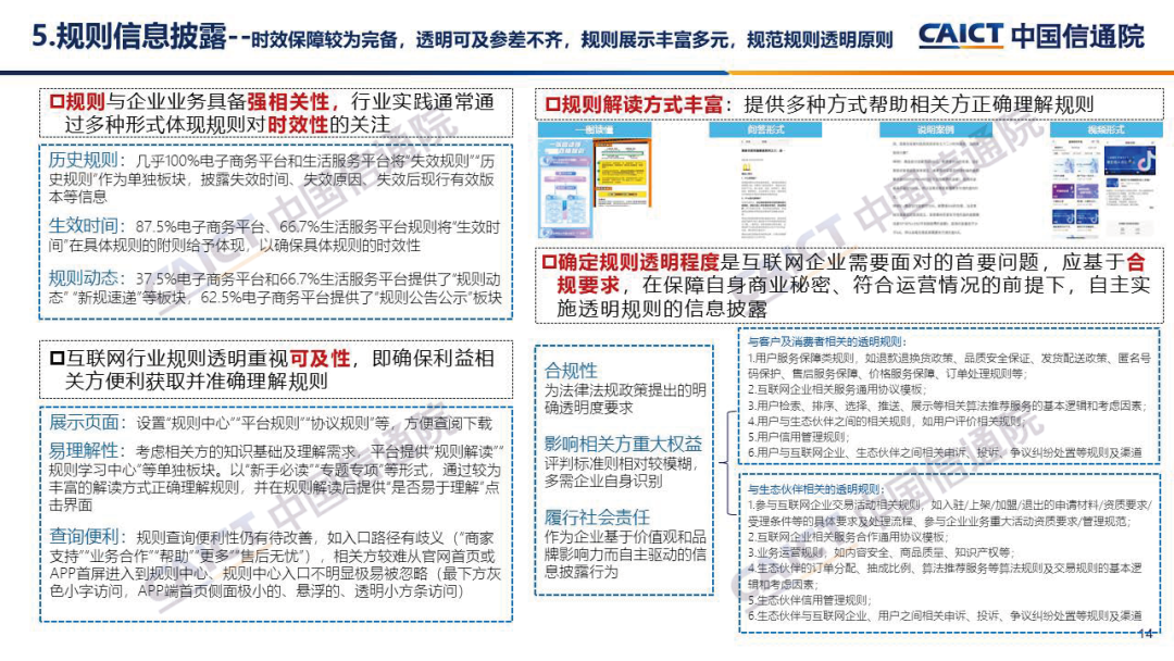 3. 互联网行业透明规则披露细分先行有待扩展。当前法律法规政策反复提及规则透明度,行业内以电子商务平台和生活服务平台为代表的细分领域已开展了相关探索,并在时效性、可及性、自主性、参与性方面积累了良好的实践做法。基于规则透明对企业内外部生态系统的重要意义,行业需进一步拓宽透明规则适用范围,积极引导相关方访问规则中心、查阅规则内容、参与规则意见征集及制修订过程,助力互联网行业社会共治体系的最终实现。