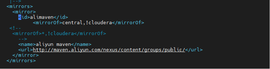 <mirrors><mirror><id>alimaven</id><mirrorOf>central,!cloudera</mirrorOf><name>aliyun maven</name><url>http://maven.aliyun.com/nexus/content/groups/public/</url></mirror></mirrors>