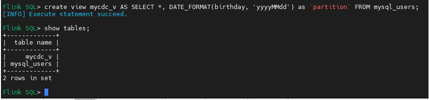 Flink SQL> create view mycdc_v AS SELECT *, DATE_FORMAT(birthday, 'yyyyMMdd') as partition