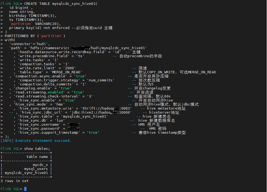 CREATE TABLE mysqlcdc_sync_hive01(id bigint ,name string,birthday TIMESTAMP(3),ts TIMESTAMP(3),`partition` VARCHAR(20),primary key(id) not enforced --必须指定uuid 主键)PARTITIONED BY (`partition`)with('connector'='hudi','path'= 'hdfs://nameservice /luo/hudi/mysqlcdc_sync_hive01', 'hoodie.datasource.write.recordkey.field'= 'id'-- 主键, 'write.precombine.field'= 'ts'-- 自动precombine的字段, 'write.tasks'= '1', 'compaction.tasks'= '1', 'write.rate.limit'= '2000'-- 限速, 'table.type'= 'MERGE_ON_READ'-- 默认COPY_ON_WRITE,可选MERGE_ON_READ, 'compaction.async.enabled'= 'true'-- 是否开启异步压缩, 'compaction.trigger.strategy'= 'num_commits'-- 按次数压缩, 'compaction.delta_commits'= '1'-- 默认为5, 'changelog.enabled'= 'true'-- 开启changelog变更, 'read.streaming.enabled'= 'true'-- 开启流读, 'read.streaming.check-interval'= '3'-- 检查间隔,默认60s, 'hive_sync.enable'= 'true'-- 开启自动同步hive, 'hive_sync.mode'= 'hms'-- 自动同步hive模式,默认jdbc模式, 'hive_sync.metastore.uris'= 'thrift://hadoop:9083'-- hive metastore地址-- , 'hive_sync.jdbc_url'= 'jdbc:hive2://hadoop:10000'-- hiveServer地址, 'hive_sync.table'= 'mysqlcdc_sync_hive01'-- hive 新建表名, 'hive_sync.db'= 'luo'-- hive 新建数据库名, 'hive_sync.username'= ''-- HMS 用户名, 'hive_sync.password'= ''-- HMS 密码, 'hive_sync.support_timestamp'= 'true'-- 兼容hive timestamp类型);