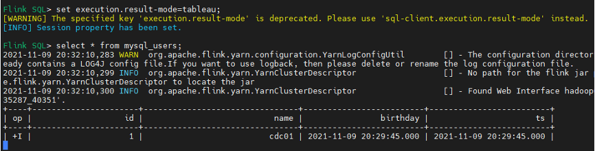 [WARNING] The specified key 'execution.result-mode' is deprecated. Please use 'sql-client.execution.result-mode' instead.