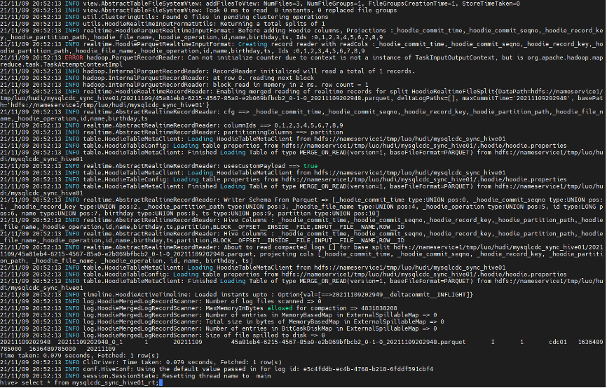 hive> select * from mysqlcdc_sync_hive01_ro; --已查询到mysq insert的一条数据