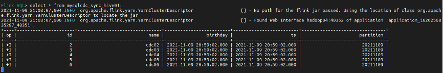 Flink SQL> select * from mysqlcdc_sync_hive01; --已查询到一条insert数据