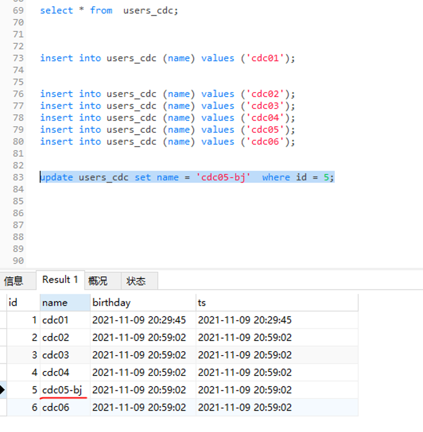 update users_cdc set name = 'cdc05-bj'where id = 5;
