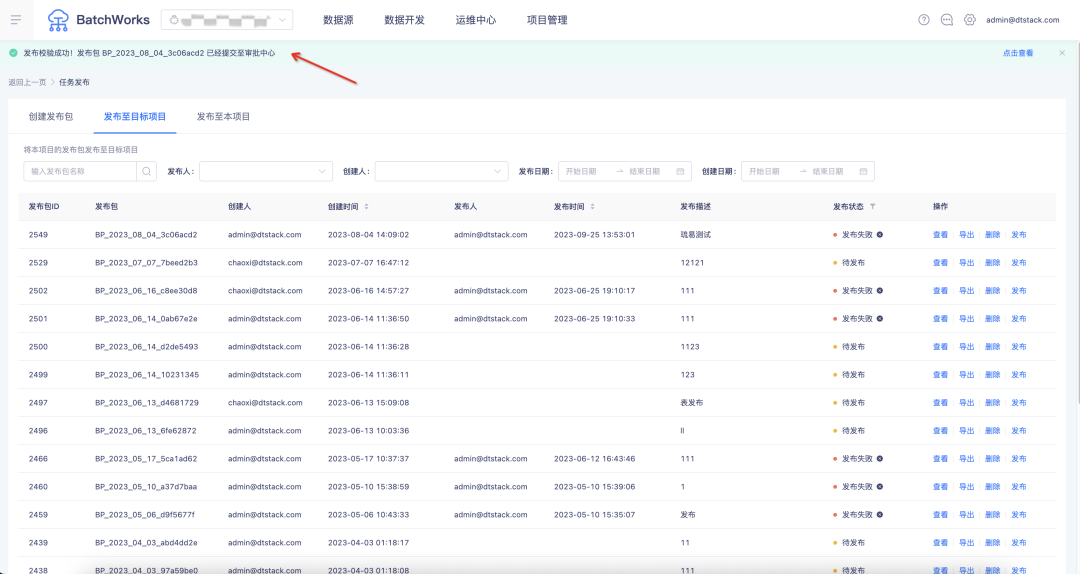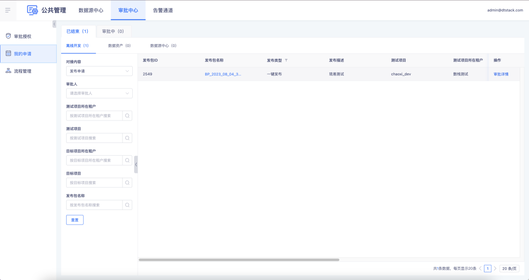 新增功能说明:开启发布审批流程后,在离线执行发布动作后,审批人需要先在审批中心进行审批后,发布流程才可继续进行。