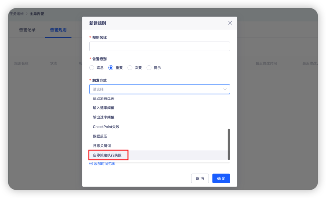 2.全局/任务告警新增“启停策略执行失败”触发方式