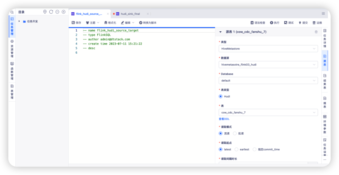 支持引入 HMS 数据源,并且可以在 FlinkSQL 向导模式的源表/结果表选择 Hudi 表。