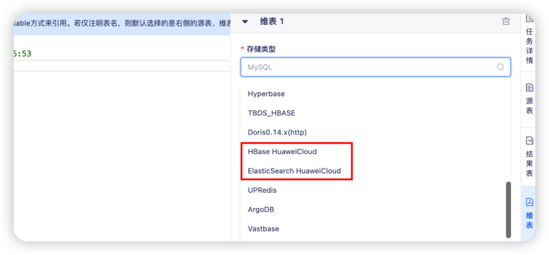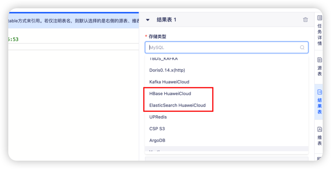 支持在结果表/维表中选择使用适配 fusioninsight/MRS 集群的 HBase/ES HuaweiCloud 数据源。