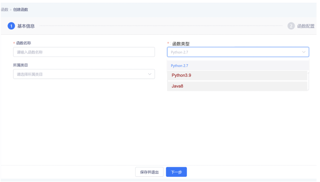 第二步:点击「新建自定义函数」进入函数设置窗口,配置函数信息并将打包好的文件上传。