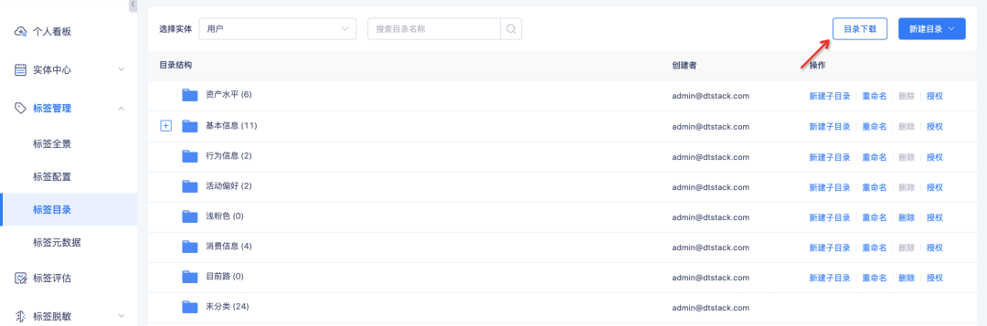 • 进入项目A的标签目录列表中,点击「目录下载」下载目录文件