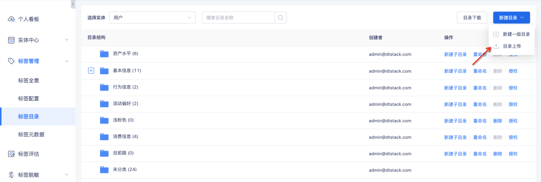• 进入项目B的标签目录列表中,点击「目录上传」上传目录文件