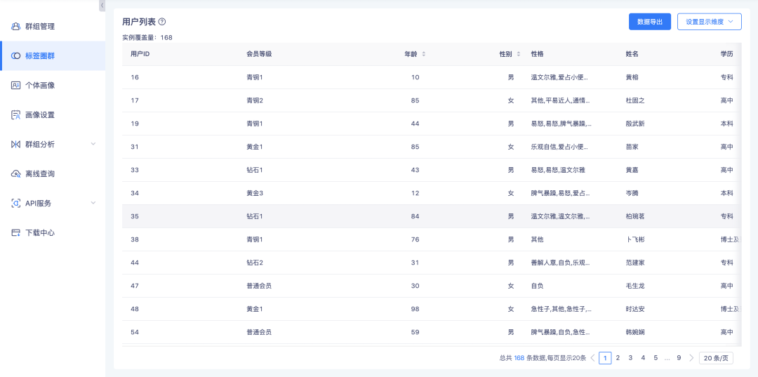 标签圈群实例列表页、群组详情群体列表页、群组交并差等页面,页面滑动至列表区域,列表区域可全幅显示,展示更多内容。