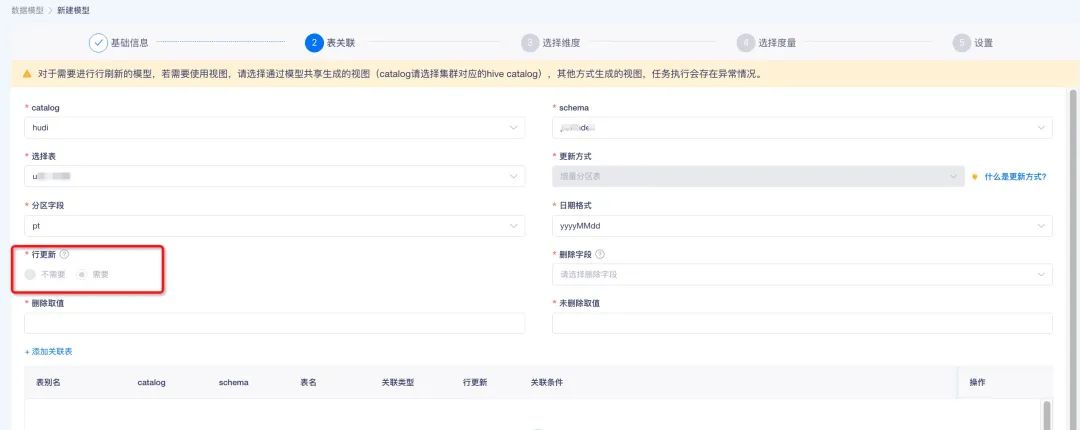 • 创建数据模型时,对于源表涉及到行更新的 hudi 表,将其设置为需要行更新,创建模型后,系统将为该表提供一个接口,供传入变更数据条件