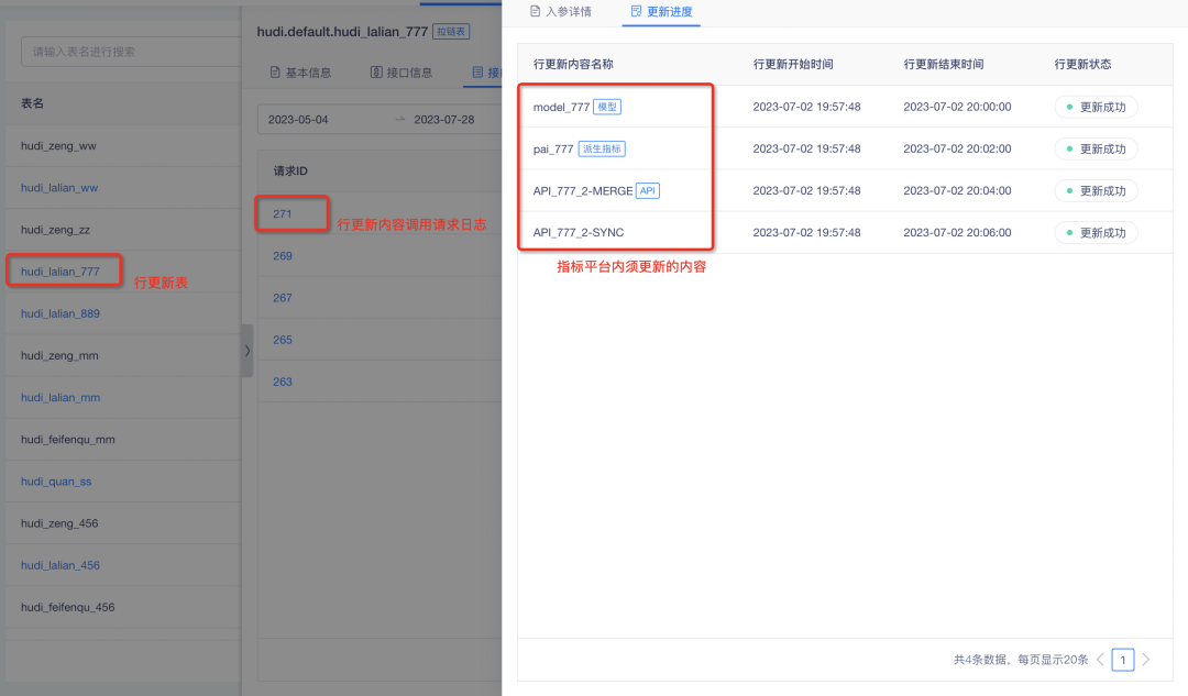 1)入参:表信息、请求id、行更新涉及模型标识/指标标识/API 名称