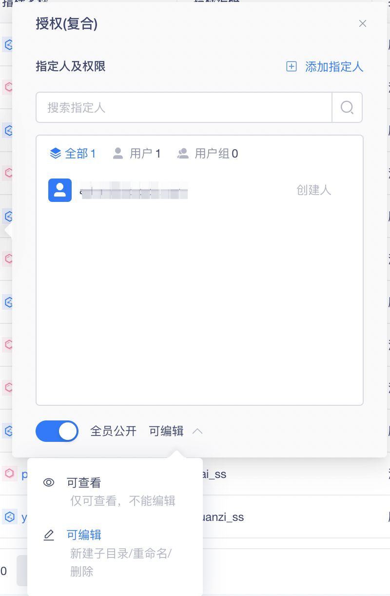 授权页面,系统会默认将新创建的目录设置为全员可编辑,在此基础上,可修改为全员可查看、部分用户可编辑;也可关闭全员设置,只对部分用户开放查看、编辑操作。