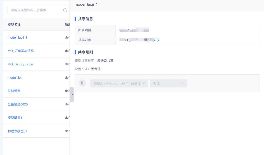 体验优化说明:点击共享的指标/模型名称,可查看对应的内容详情,包括共享信息及共享规则。