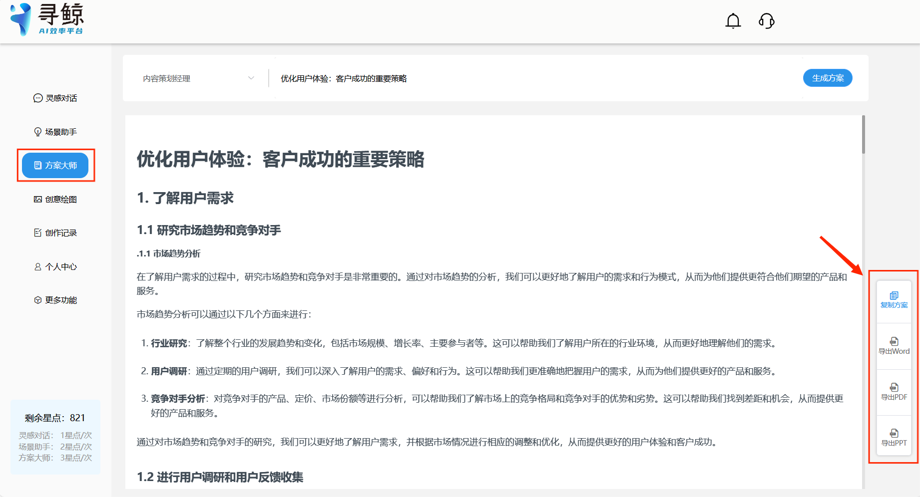 1.寻鲸AI“方案大师”可以选择岗位/角色,输入具体类型和名称就可以生成结构完整的长篇方案,内置足够多的行业和岗位。而且支持Word、PDF等多种导出方式,这样企业可以更方便下载生成的文案。