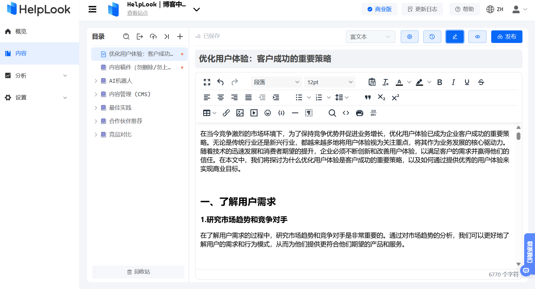 2.您可以将导出的文件直接上传到自己的网站、社交媒体、邮件营销或其他站内渠道,以触达更广泛的受众,并增加品牌曝光和市场影响力。以HelpLook为例,导出word文档后,转到HelpLook内容站点后台,将word文档导入,之后您可以对文章进行修改、增删。您还可以对文章进行SEO配置,这样更容易被收录。