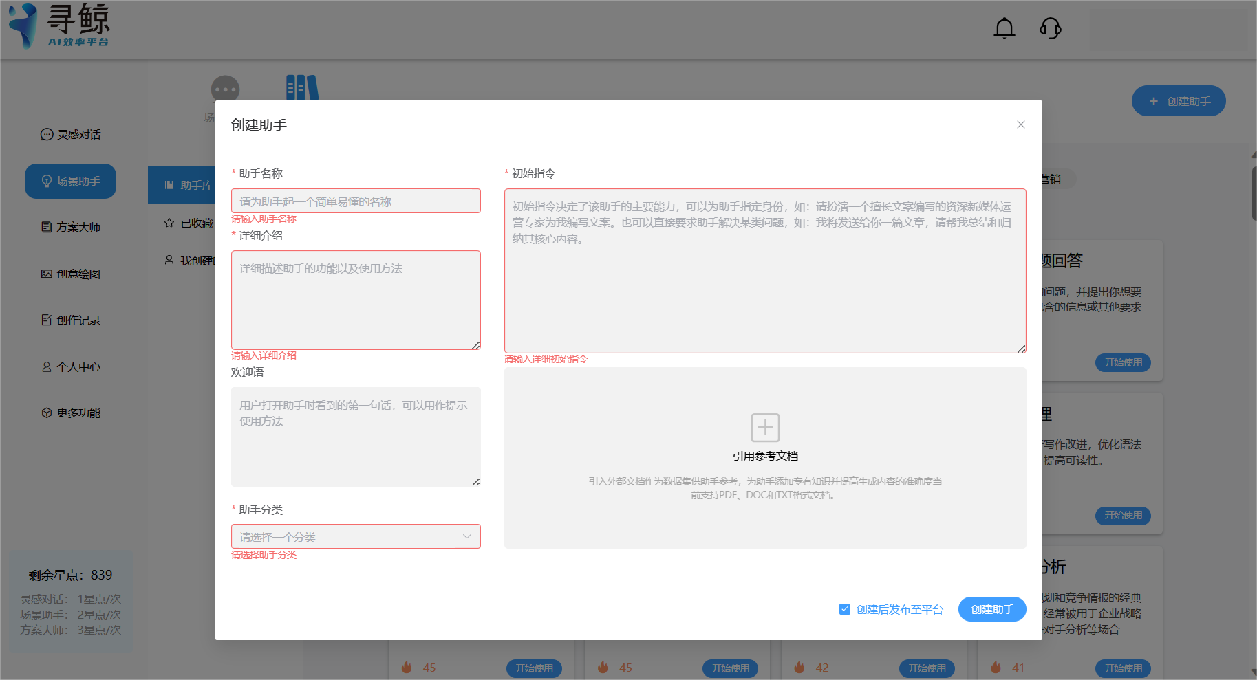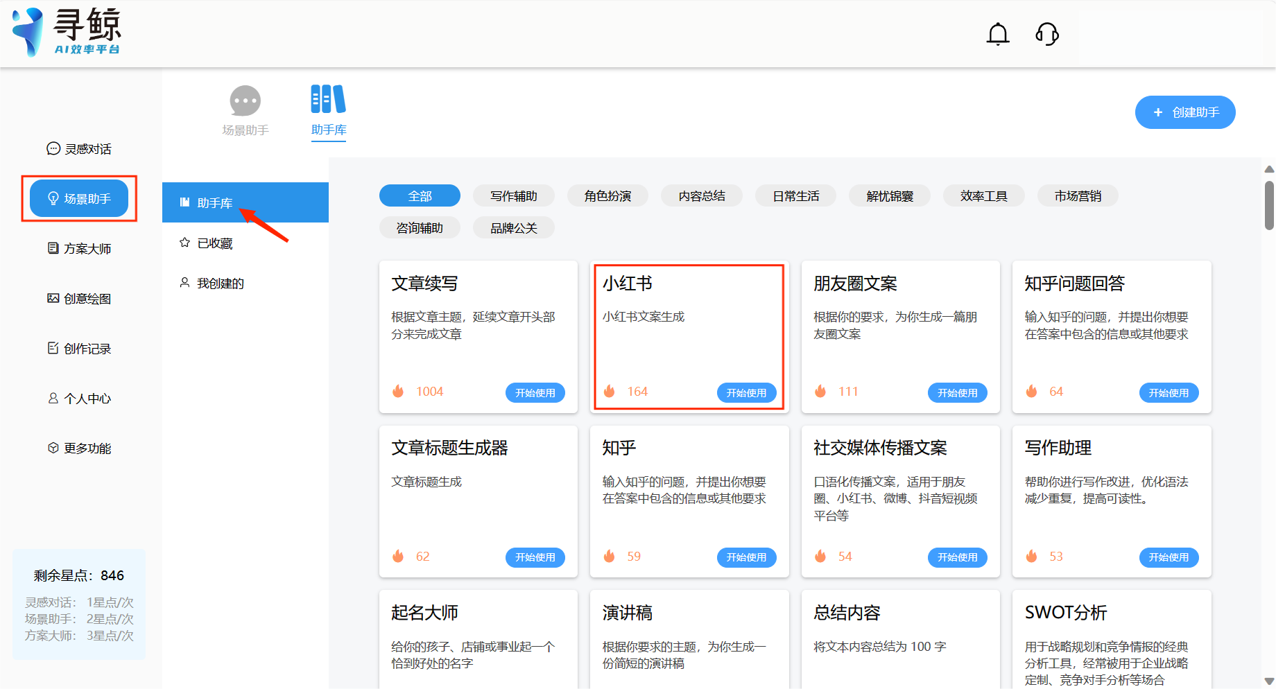 1.在寻鲸AI注册好个人账号后,选择“场景助手”,在“助手库”中找到“小红书文案生成”,便可开始使用。
