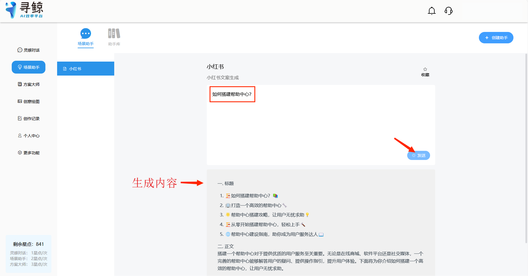 下面就以在寻鲸AI生成小红书文案,并在HelpLook官方小红书账号发布内容为例: