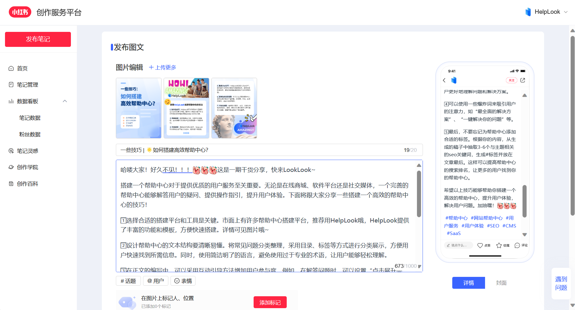 3.转到HelpLook小红书PC端后台(您也可以选择移动端发布),点击“发布图文”,按照自己的需求上传图片,上传图片之后会进到图文编辑界面。