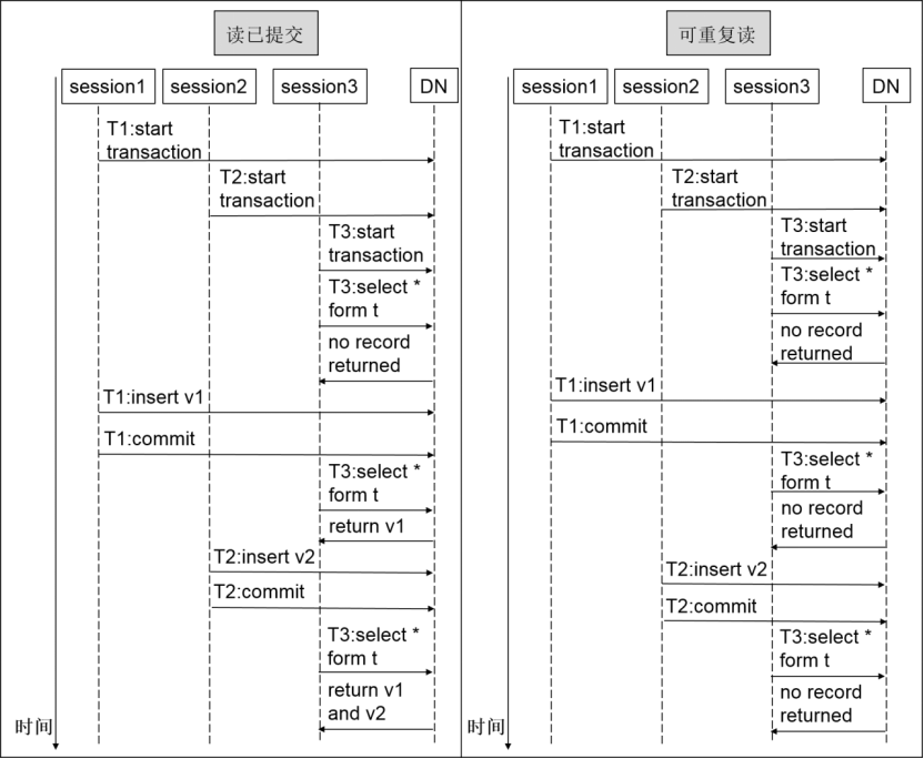 另一方面,如果采用可重复读的隔离级别,对于T3中的三条查询语句,均会采用第一条语句执行开始时的快照,而T1和T2均在该快照中,因此在该隔离级别下,T3的三条查询语句均不会返回v1和v2。