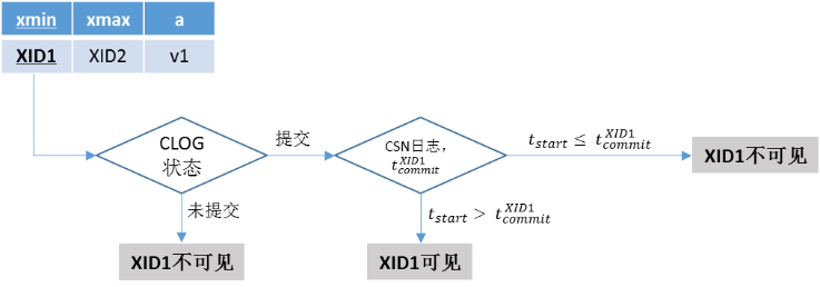 如图所示,在一个事务的实际执行过程中,并不会在一开始就加载全量的CSN日志,而是在扫描到某条记录以后,才会去CSN日志中查询该条记录头部xmin和xmax这两个事务号对应的CSN值,并基于此进行可见性判断。