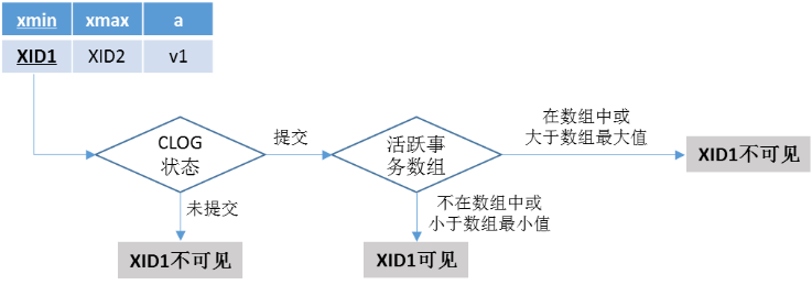 在数据库进程中,维护一个全局的数组,其中的成员为正在执行的事务信息,包括事务的事务号,该数组即活跃事务数组。在每个事务开始的时候,拷贝一份该数组内容。当事务执行过程中扫描到某个元组时,需要通过判断元组xmin和xmax这两个事务(即元组的插入事务和删除事务)对于查询事务的可见性,来决定该元组是否对查询事务可见。以xmin为例,首先查询CLOG,判断该事务是否提交,如果未提交,则不可见;如果提交,则进一步判断该xmin是否在查询事务的活跃事务数组中。如果xmin在该数组中,或者xmin的值大于该数组中事务号的最大值(事务号是全局递增发放的),那么该xmin事务一定在该查询事务开始之后才会提交,因此对于查询事务不可见;如果xmin不在该数组中,或者小于该数组中事务号的最小值,那么该xmin事务一定在该查询事务开始之前就已经提交,因此对于查询事务可见。上述判断逻辑如图所示。