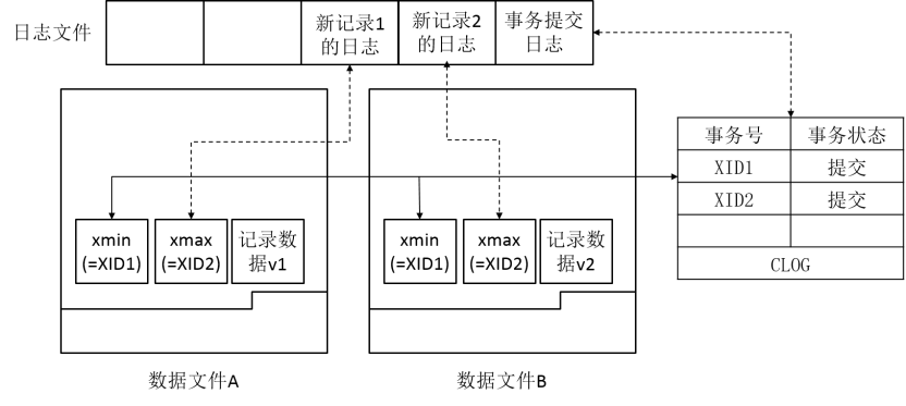 - 如果在事务写下提交日志之前,数据库发生宕机,那么数据库恢复过程中虽然会把这两条记录插入到数据页面中,但是并不会在CLOG中将该插入事务号标识为提交状态,后续查询也不会返回这两条记录。
