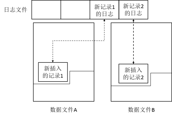 对于本例,在数据库恢复过程中,首先读取到在数据文件A中插入记录的日志,将数据文件A读取上来之后,发现数据文件A中已经包含该记录,因此该日志无需回放;然后读取到在数据文件B中插入记录的日志,将数据文件B读取上来之后,发现数据文件B中未包含新插入的记录,因此需要将日志中的记录再次写入到数据文件B中,从而完成恢复。最终,该事务对于数据库所有的修改都得以恢复出来,事务的持久性得到了保证。