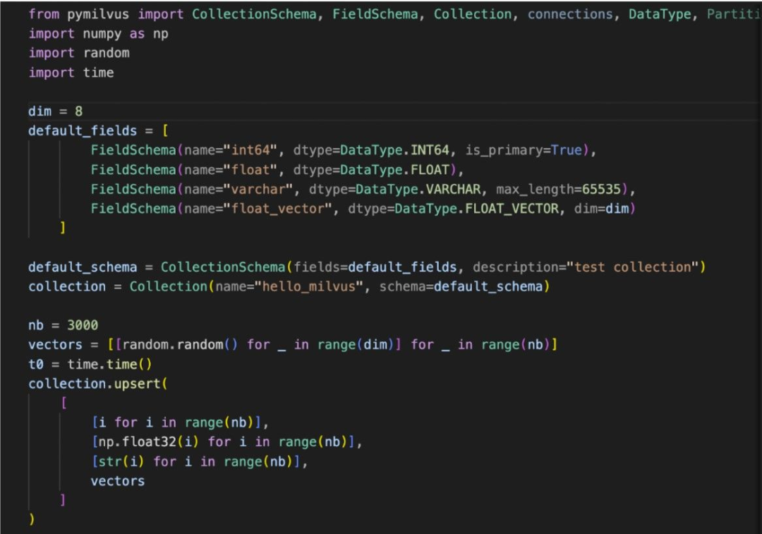 Upsert 使用方法简单,类似于插入操作。用户可以轻松将 Upsert 集成到现有的工作流程中,无需对原有流程进行大改。在 Pymilvus 等 SDK 中,Upsert 命令调用和插入命令完全一致。熟悉 Milvus 的用户使用起来没有任何难度,可以获得一致和丝滑的用户体验。