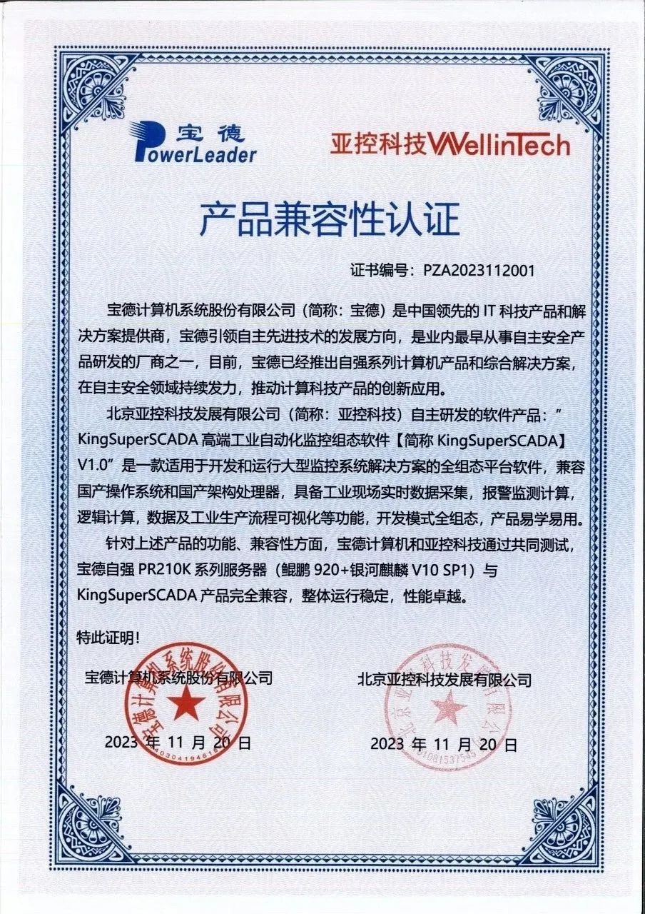 经过双方一系列全面严谨的认证测试后,双方认定亚控科技高端工业自动化监控组态软件平台KingSuperSCADA与宝德自强 PR210K系列服务器(鲲鹏920+银河麒麟V10 SP1)完成兼容性测试,能够达到通用兼容性要求及性能、可靠性要求,满足用户的关键性应用需求。
