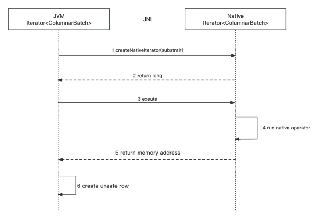 - 传递数据,通过 Spark SQL 提供的向量化框架实现。Spark SQL 的社区版本默认提供了 Row-based 的实现,算子操作的对象是 Row,而在向量化框架里,算子操作的对象是 ColumnarBatch,一个 ColumnarBatch 可以包含多行数据,ColumnarBatch 里每个字段的数据结构是 Column Vector