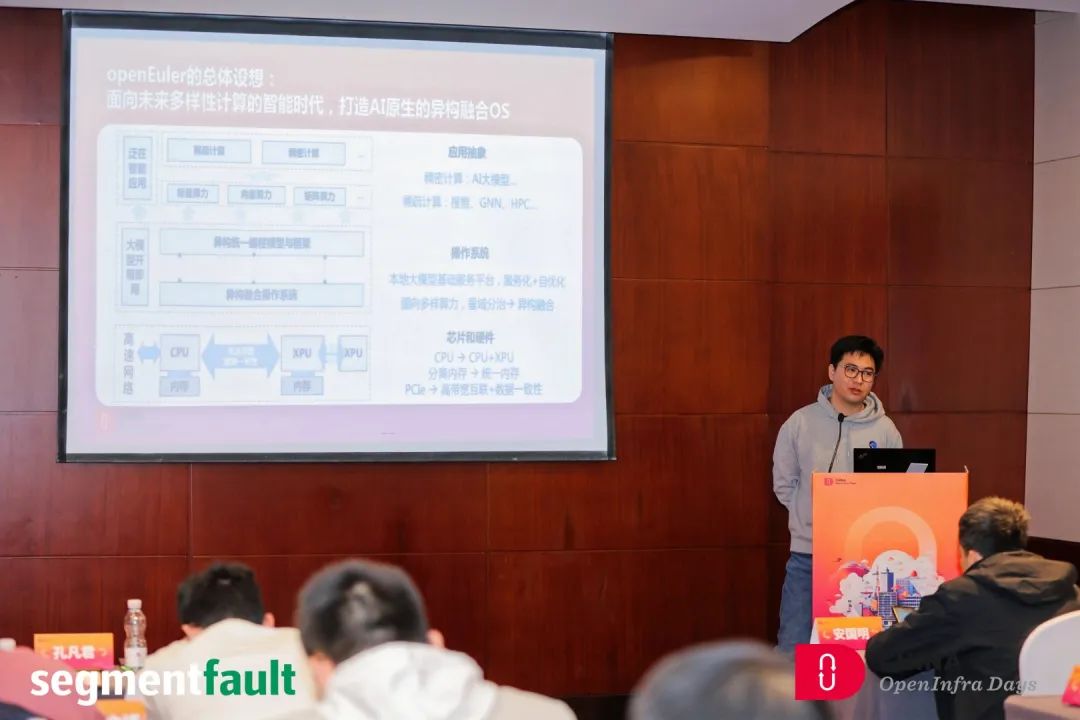 在可持续计算&AI基础设施专题上,openEuler社区Maintainer郑振宇以《大模型时代的基础设施:LOKI for AI》为主题进行分享,LOKI(Linux OpenStack K8S Infrastructure)作为最成熟的开源基础设施解决方案,是实现大模型时代开源基础设施方案的最佳选择,但目前面临XPU资源管理、分布式训练适配、端边云协同推理等技术挑战。郑振宇老师从OS、云基础设施、云原生平台等维度,结合当前openEuler社区在OS for AI领域的规划与实践带来相关分享。