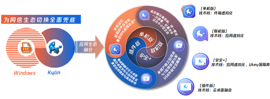 在行业网信建设的过程中,用户原有应用环境复杂,以及国内上层应用、基础软硬件发展不均衡等现状,拖慢了行业网信改造工作的步伐。针对客户原有Windows业务系统短期内无法直接运行在国产系统之上的问题,麒麟软件推出了跨系统应用生态融合解决方案,从“终端、应用、云”全栈技术覆盖的角度为用户提供场景化的生态融合解决方案。