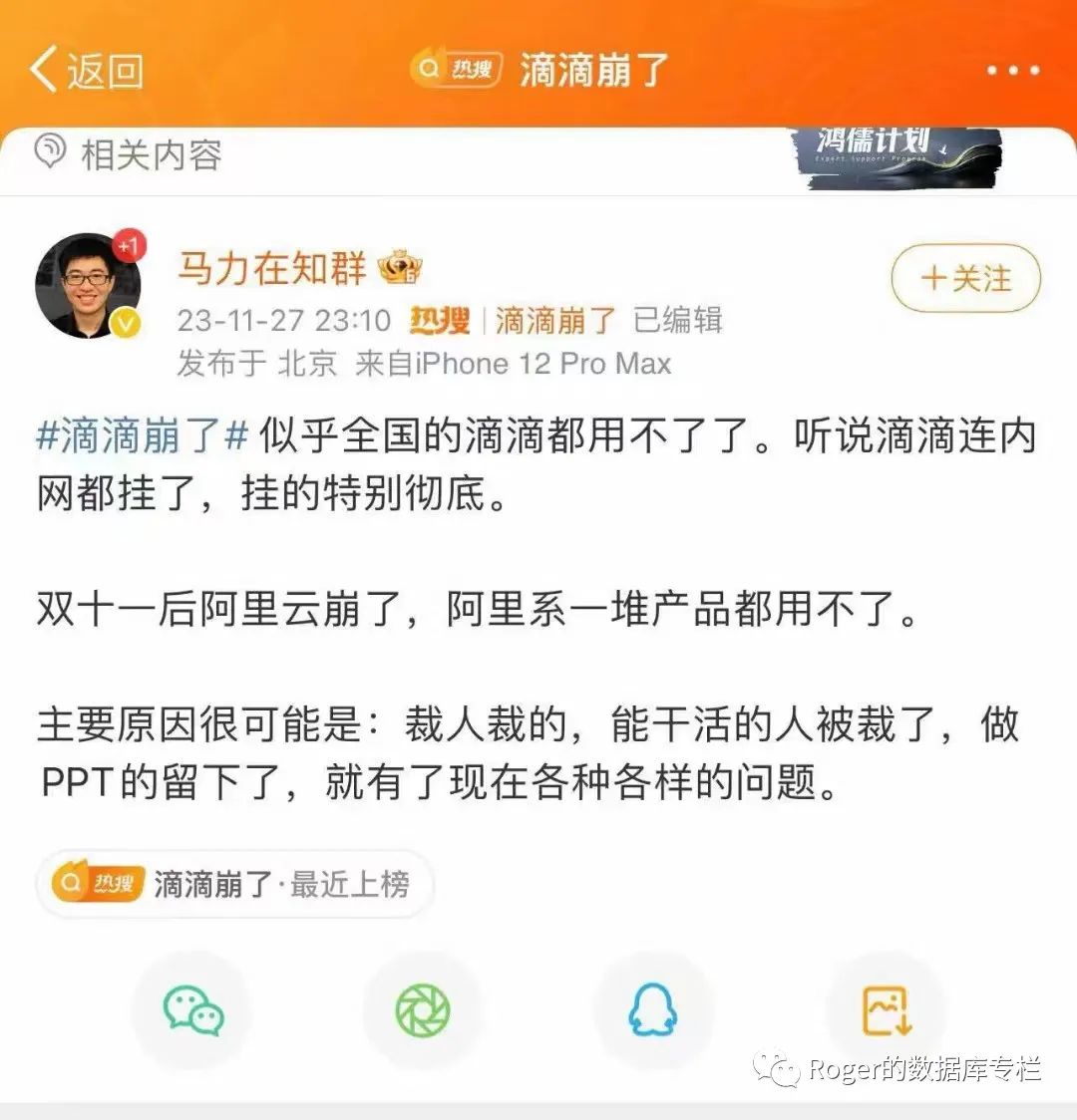 不知道为什么最近故障频发,小道消息说是人员优化了干活主流,留下了一些ppt忽悠高手.....刚看一个视频提到,按照滴滴的运营数据来看,一天多少3300w单,此次故障直接到手营收损失4个亿;根据滴滴的抽成比例平均25%来算,大概就是损失1个亿的利润呀!可怜的是运维的兄弟估计绩效全部要打C了....说到系统故障,实际上我们作为数据库厂商,每年也要经历多次故障,甚至是一些我方人员的失误而导致的。我们也曾经做过很多的努力和尝试,发现故障总是难以避免。这种其中有太多的原因,这里大概简单总结几点:1、 运维系统流程不规范、缺乏监管,缺乏AB角(这个范围很大很大)